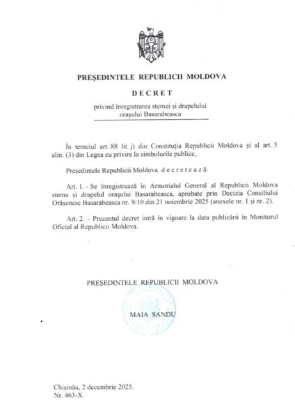 Примэрия города Басарабяска сообщает о том, что 02 декабря 2025 года президентом Республики Молдова, Майей Санду, был подписан декрет о регистрации герба и флага города Басарабяска. Теперь наш город имеет официальные символы, определяющие его идентичность, отражающие историю, культурное наследие и независимость города.