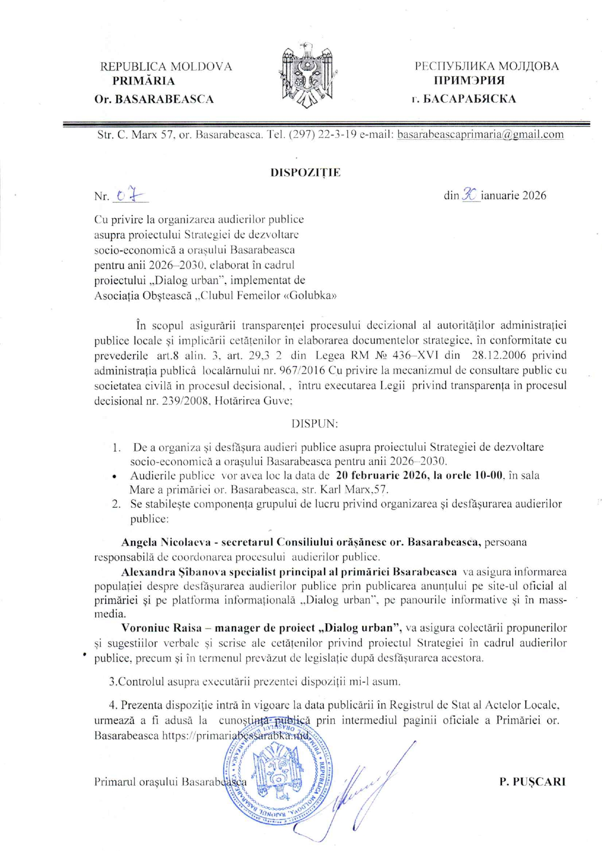 Примэрия города Басарабяска приглашает жителей города принять участие в публичных слушаниях по проекту Стратегии социально-экономического развития города Басарабяска на 2026–2030 годы, разработанному в рамках проекта «Городской диалог», реализуемого ОО «Женский клуб „Голубка“».